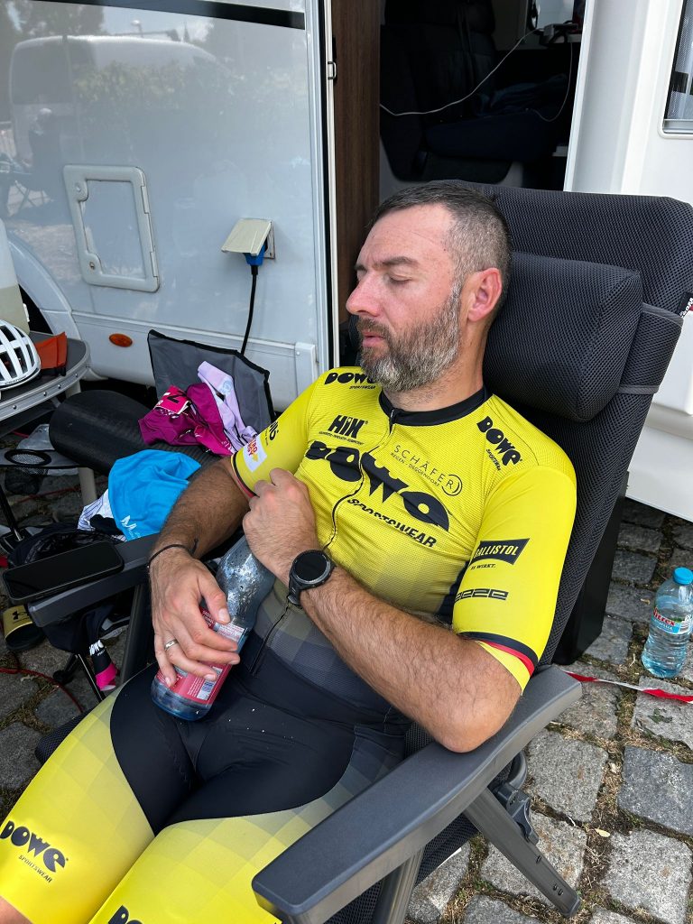 Mit höher steigender Sonne änderte sich dies. Die Strecke füllte sich langsam wieder. Einige Fahrer hatten wohl länger geschlafen. Ich fuhr mein Ding weiter, aber irgendwann am Vormittag übermannte mich die Erschöpfung. Die Belastung bei solch einem Rennen ist nochmal komplett was anderes wie bei meinen sonstigen Rennen. Mittags habe ich somit kurz noch eine Pause einlegen wollen. Ich setzte mich in einem Campingstuhl und schlief sofort ein, ohne dass ich es beeinflussen konnte.